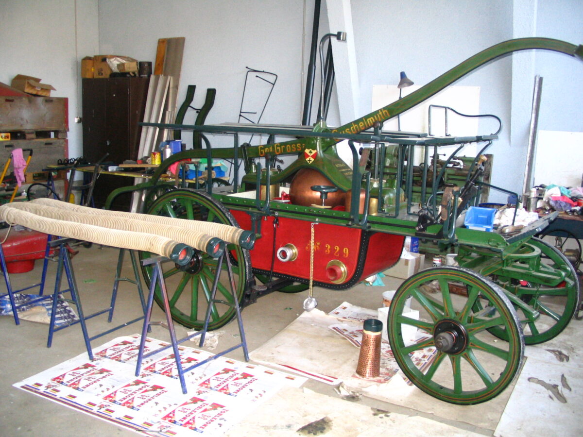 Die Schlauchwagen waren dafür da, die Wassertransportschläuche platzsparend aufzurollen und schnell und unkompliziert an den Einsatzort zu transportieren.